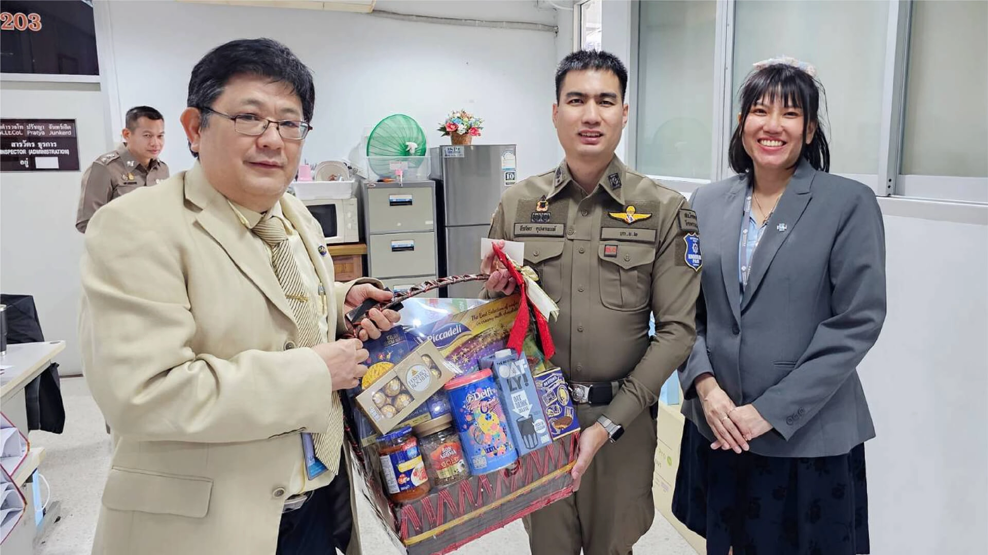 รอง ผกก.สส.สน.โคกคราม, พ.ต.ท.ธีรภัทร คุปตานนท์ รอง ผกก.ป.สน.โคกคราม, พ.ต.ท.ปรัชญา จันทร์เกิด สว.อก.สน.โคกคราม, พ.ต.ต.ธวัชชัย พันธ์จิ๋ว สว.จร.สน.โคกคราม และเจ้าหน้าที่ผู้ปฏิบัติงานสถานีตำรวจนครบาลโคกคราม เพื่อแสดงความขอบคุณเจ้าหน้าที่ตำรวจทุกท่านที่ช่วยดูแลความปลอดภัย ให้กับคนในชุมชนเป็นอย่างดีตลอดมา ณ สถานีตำรวจนครบาลโคกคราม เมื่อวันที่ 18 มกราคม 2567 ที่ผ่านมา
